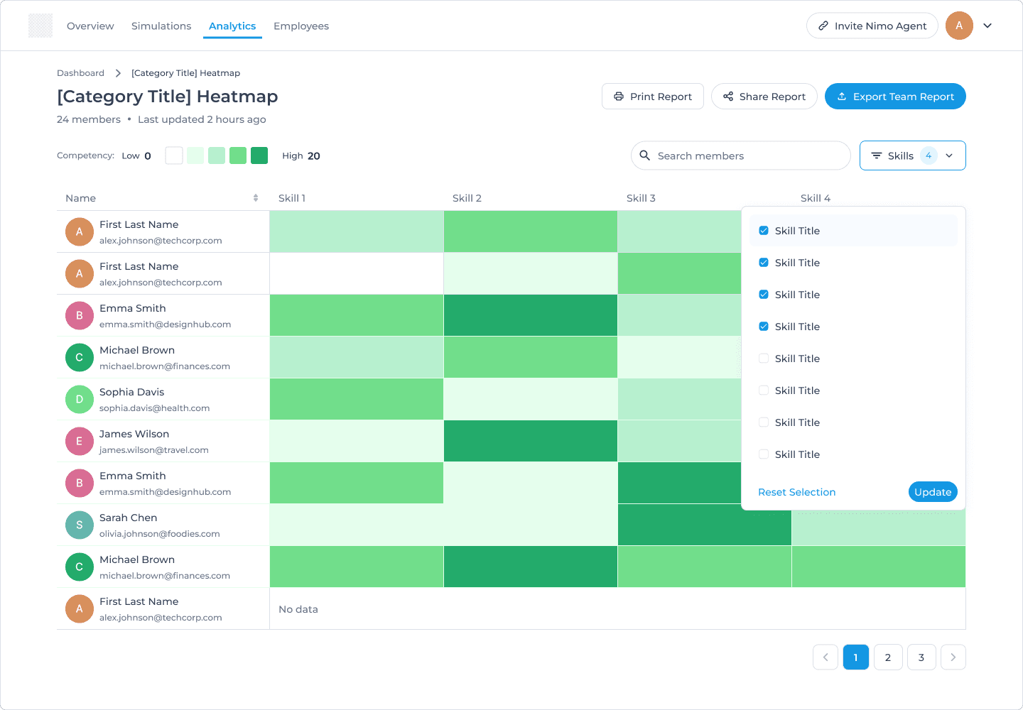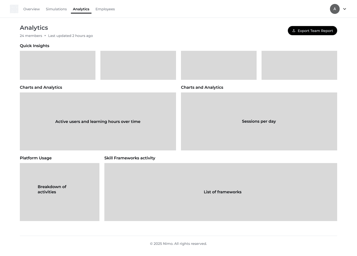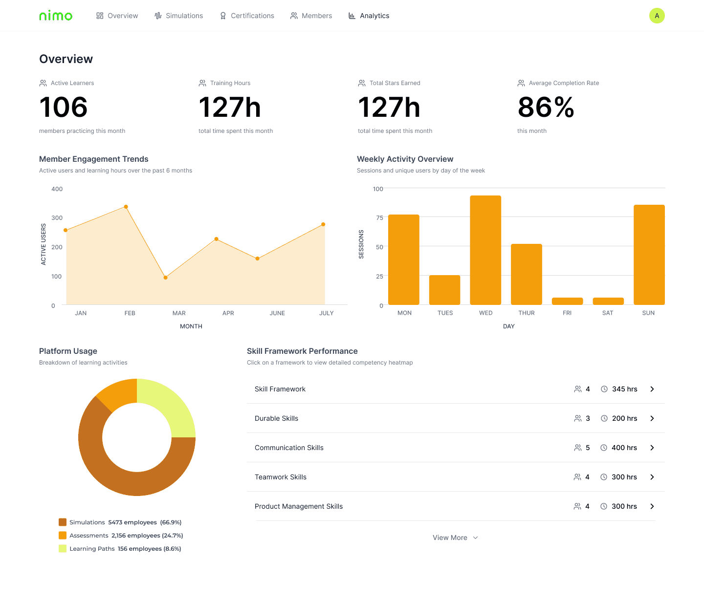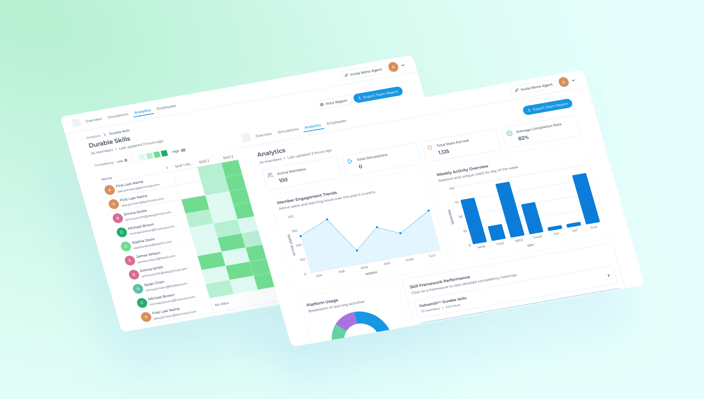 I designed Nimo's analytics dashboard from the ground up, creating the platform's first reporting capability for skills assessment data. By organizing information into overview metrics and skills heatmaps, admins could quickly identify training gaps and track performance across skills competencies.
