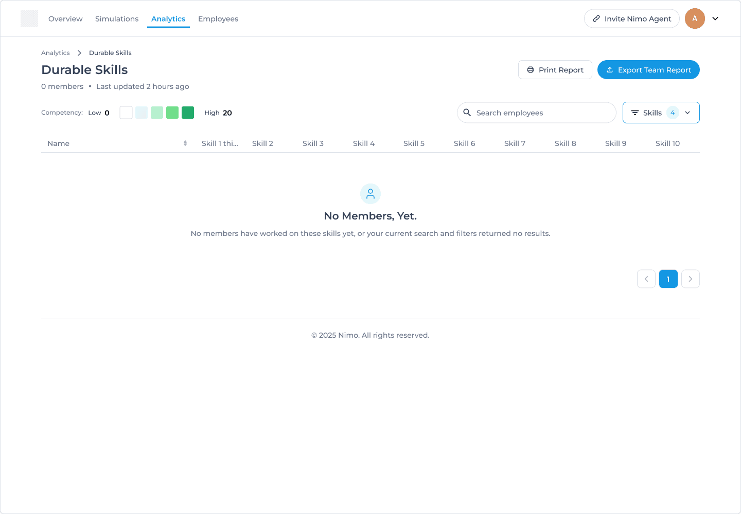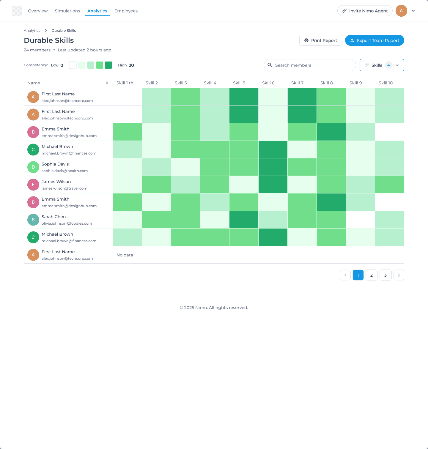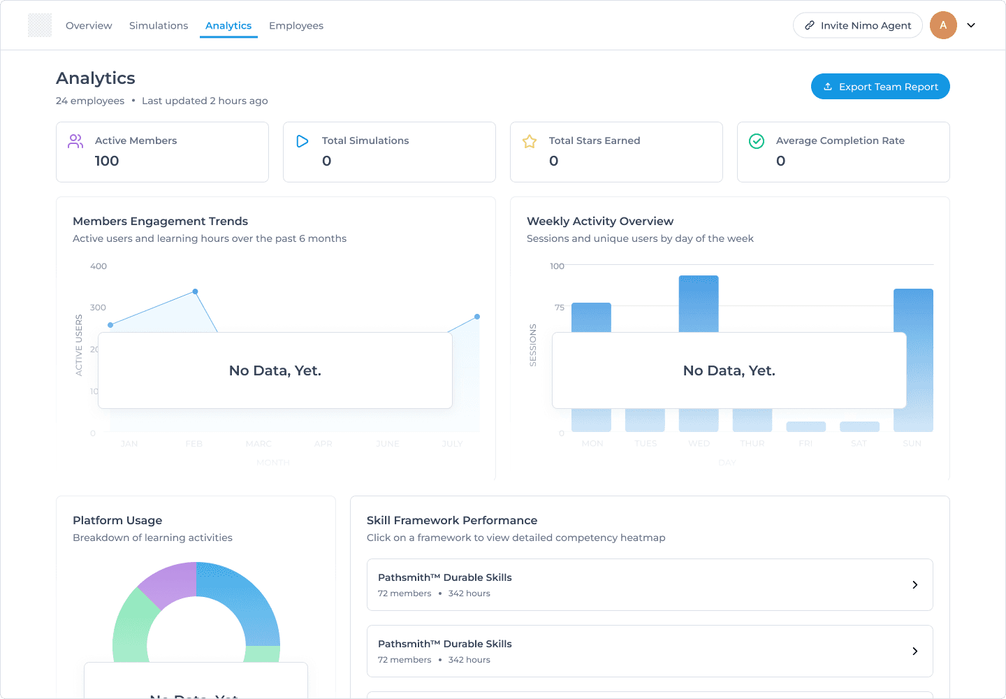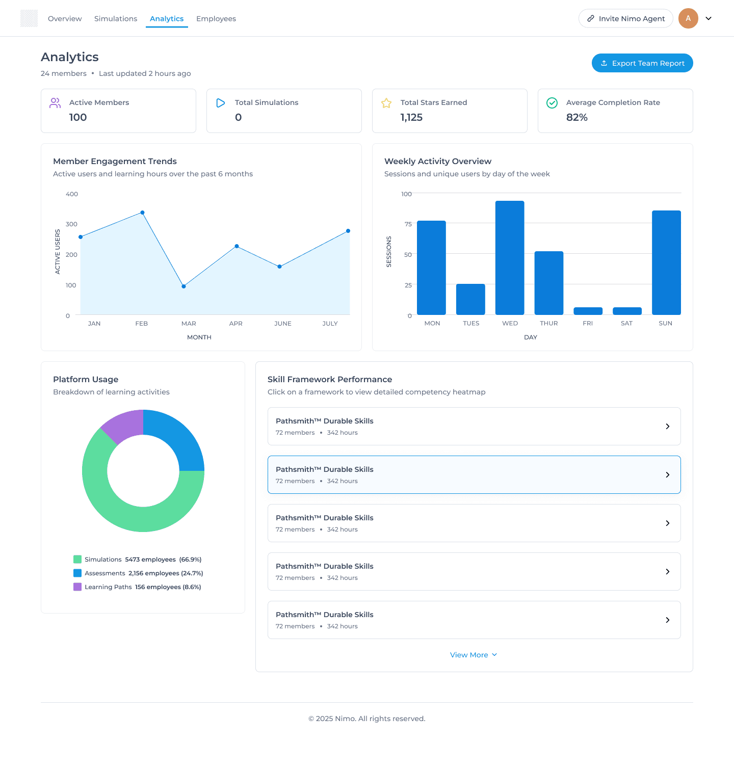 I designed Nimo's analytics dashboard from the ground up, creating the platform's first reporting capability for skills assessment data. By organizing information into overview metrics and skills heatmaps, admins could quickly identify training gaps and track performance across skills competencies.
